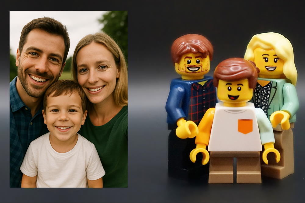 Share photos of the people you’d like featured and we’ll craft personalized characters to bring your custom-made brick portrait to life